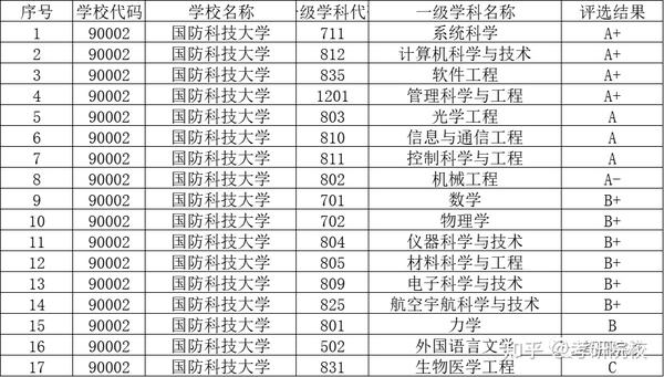 根据教育部公布的全国第四轮学科评估结果可知,国防科技大学有系统科学、计算机科学与技术、软件工程、管理科学与工程等4个一级学科被评为A+,以下是具体评估结果,供大家参考: