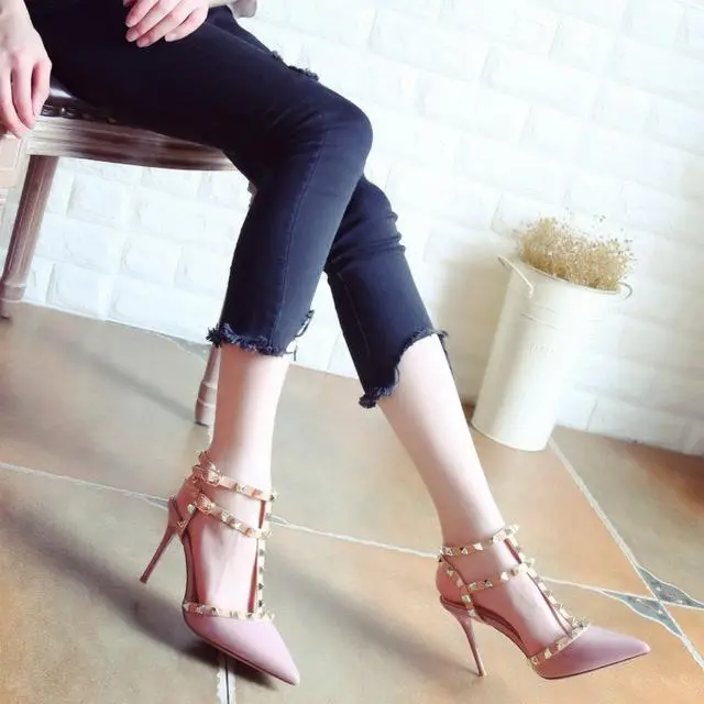 一提到又细又高的鞋必定与性感二字挂钩,不仅让你看起来女人味十足,还可以在视觉上延长腿部线条,显高哦! 尖头设计,让双脚显小,增添女性的灵动的魅力。造型尤为舒适,让脚呈现不一样的动人,铆钉元素一直很拉风,再配上一字扣予以点缀,更加的优雅甜美。随意搭配,分分钟呈现出女神范。