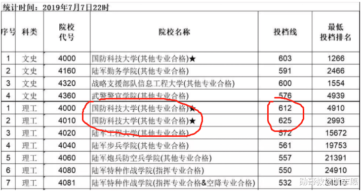 国防科技大学2019年在江西理科最低投档线为612分和615分(两个代码)文科一个代码,分数为603分。