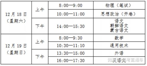 2021年12月7日上午8:00-9:30数学、10:30-12:00外语(英语、日语、俄语),下午3:00-5:00语文(蒙古语文甲、朝鲜语文)。