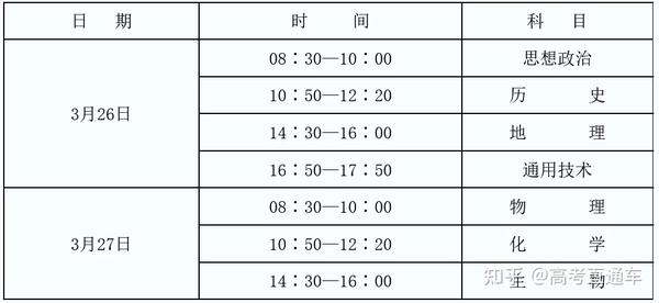 考试科目:思想政治、历史、地理、物理、化学、生物、技术(含信息技术、通用技术)。