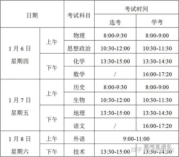 2.语文、数学、外语、思想政治、历史、地理、物理、化学、生物科目(笔试)考试:2022年1月15-17日。除语文科目考试时长为90分钟外,其他各科均为75分钟。具体如下: