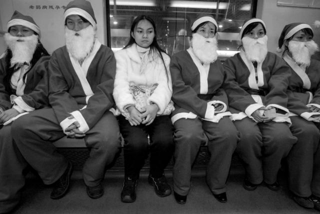 2004年12月16日,临近圣诞节,一名女子坐在地铁二号线的车厢里,两边则是圣诞老人相伴。 图片来源:澎湃新闻