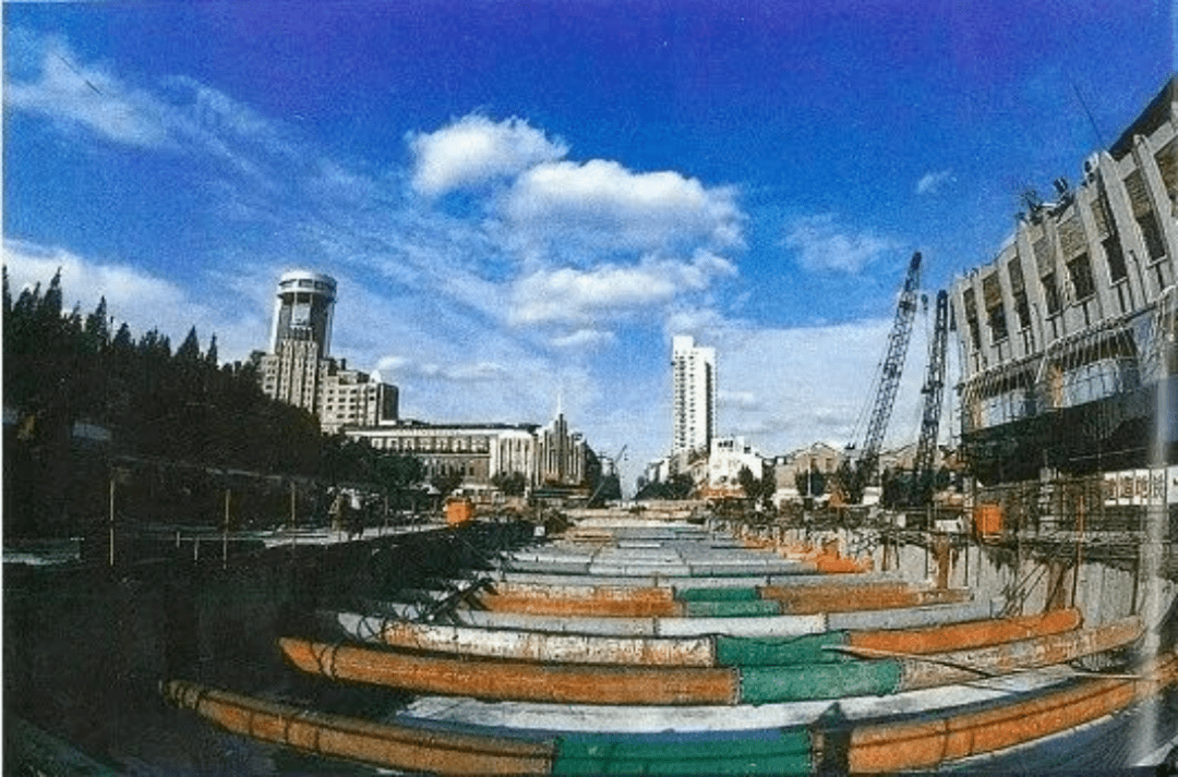 工程组集思广益,创新出“逆筑法”——也就是先做好地下连续墙,上面挖5米的土,再把顶板盖掉;然后在边上的支马路打井,人员与盾构从侧井进入淮海路底下施工;顶板上头铺管子、做路面,淮海路上照样可以通车。以此办法,淮海路实际只封了10个月零20天便通车。