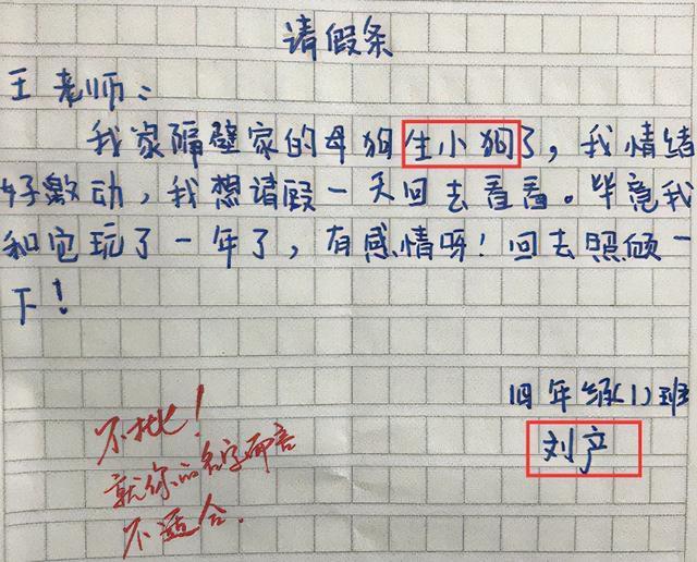 一位叫“刘产”的小学生,给老师请假要去看母狗生小狗,为了不上学也是蛮拼的,老师看完也是觉得哭笑不得,不过这样的事情请假老师肯定也是不会同意的,所以也是找了一个非常有说服力的理由,毫不犹豫地拒绝了这位同学的请假要求。