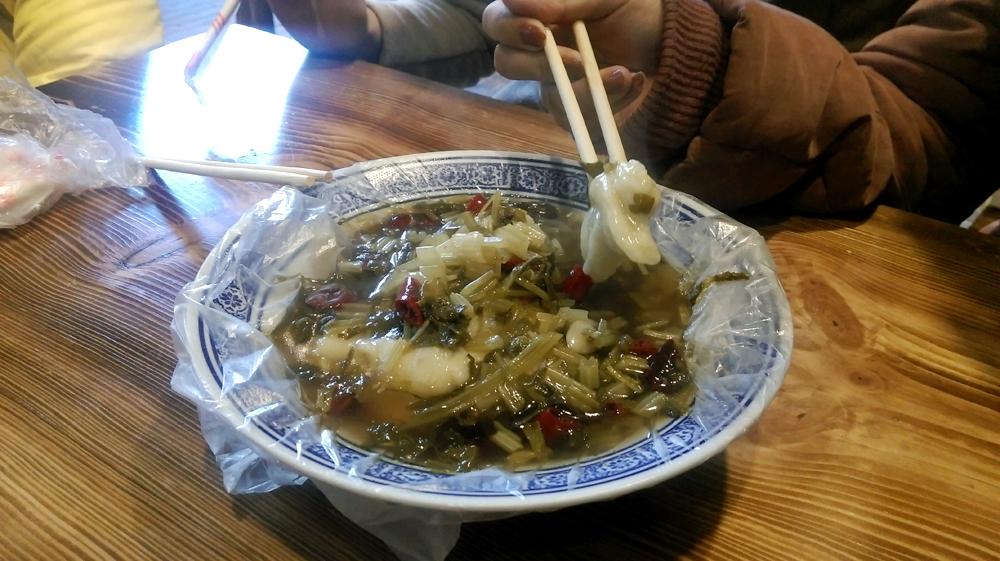 第三款:盖菜糍粑:别有风味的感觉,感觉和浆水的稍微有点类似,但是口味又不太相同。吃完后连汤带水的一并下肚,舒服!