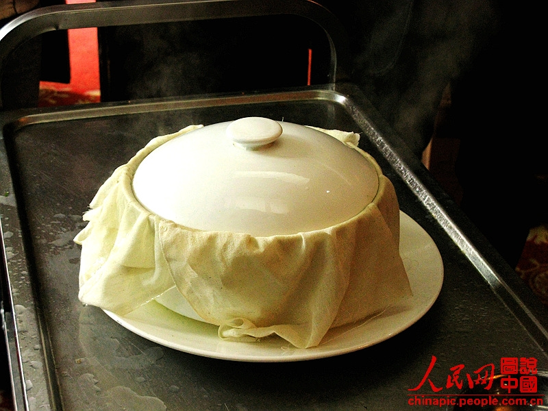 省级非物质文化遗产,据说起源于公元630年。地道的潼关肉夹馍一定是这样一层一层香香脆脆,咬一口都掉馍渣,绝对外酥里嫩。可以配成三秦套餐:冰峰、凉皮、肉夹馍。或者叫上一碗酸辣肚丝汤。参考价:肉夹馍:肥瘦7元、纯瘦8元;鸭片汤:8元;酸辣肚丝汤:10元